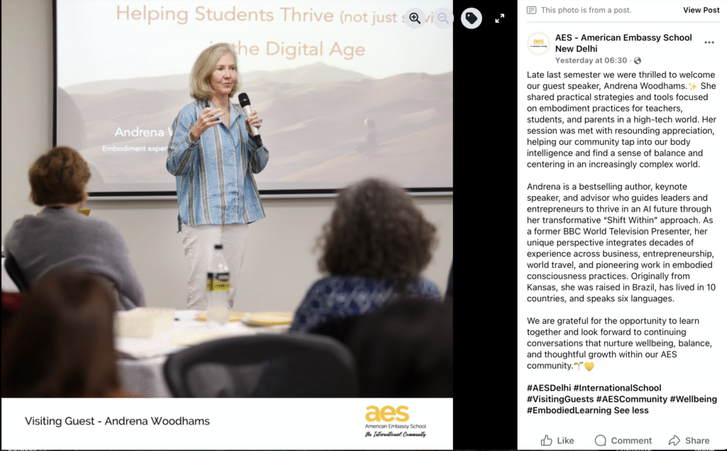 This upheaval arrived at a moment of great professional momentum. This past December, I traveled to New Delhi to lead workshops at the American Embassy School, bringing the practice of embodiment to teachers, students, and parents.